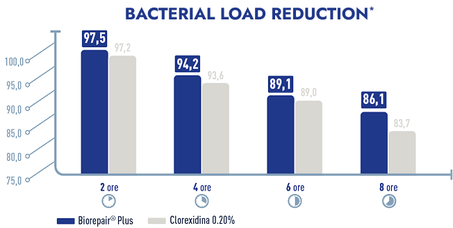 *The antibacterial action of a 60-second use of Biorepair® Plus mouthwash with the MicrorepairABX® complex compared to a 0.20% chlorhexidine-based mouthwash is laboratory-tested.